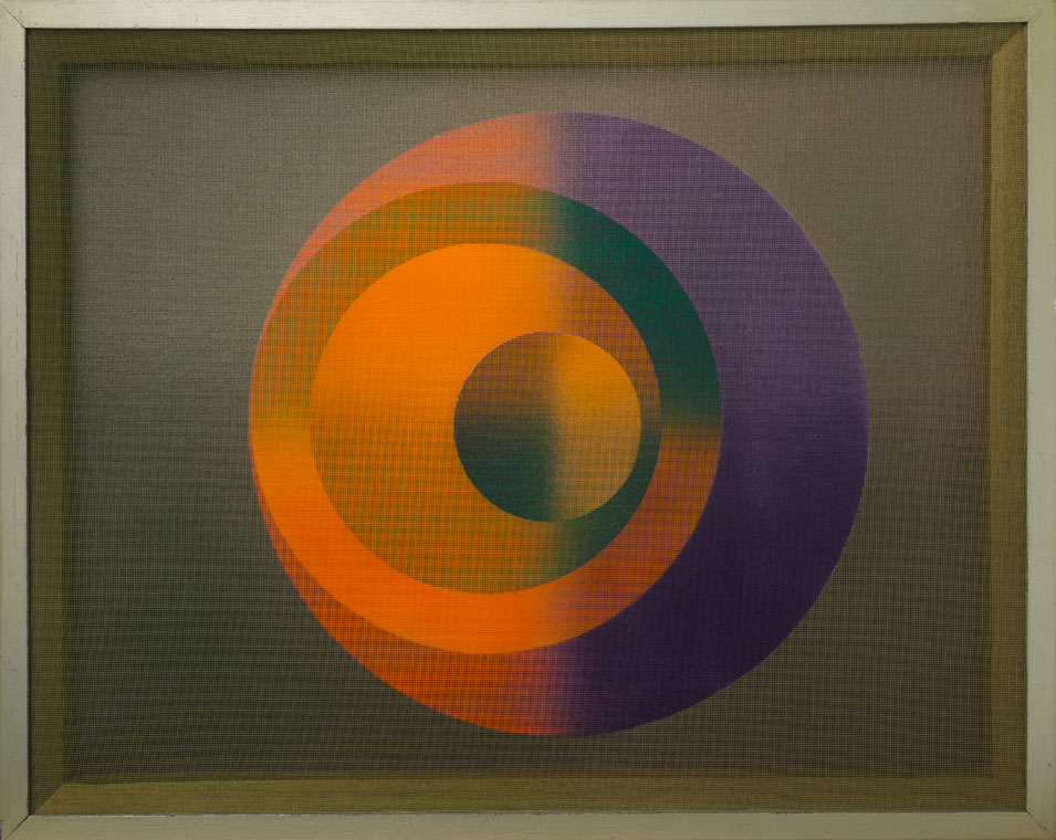 Xanti Schawinsky, Sp 502 [aus der Serie Sphärenbilder], 1977, gefärbte Gaze über Acrylfarbe auf Gewebe, 38 x 48 cm, Fondation Saner, Studen, © The Xanti Schawinsky Estate, Kilchberg, Foto: SIK-ISEA, Zürich (Philipp Hitz)