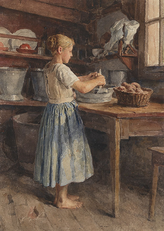 Albert Anker, Kartoffelschälendes Mädchen, nicht datiert, Aquarell auf Papier, 35 x 25 cm, Privatbesitz (Archiv-Nr. 67232)