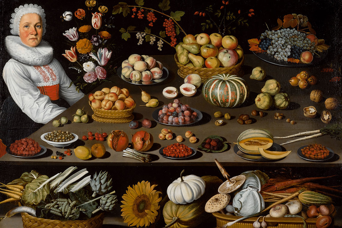 Albrecht Kauw, Grosses Stillleben mit sitzender Frau, um 1662/1664, Öl auf Leinwand, 121 x 180 cm, Privatbesitz (Archiv-Nr. 87972)