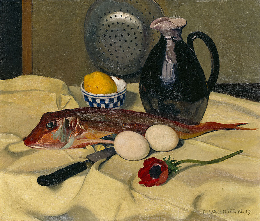 Félix Vallotton, Nature morte avec poisson, œufs, coquelicot et couteau, 1919, Öl auf Leinwand, 46,5 x 55,5 cm, Privatbesitz (Archiv-Nr. 85255)