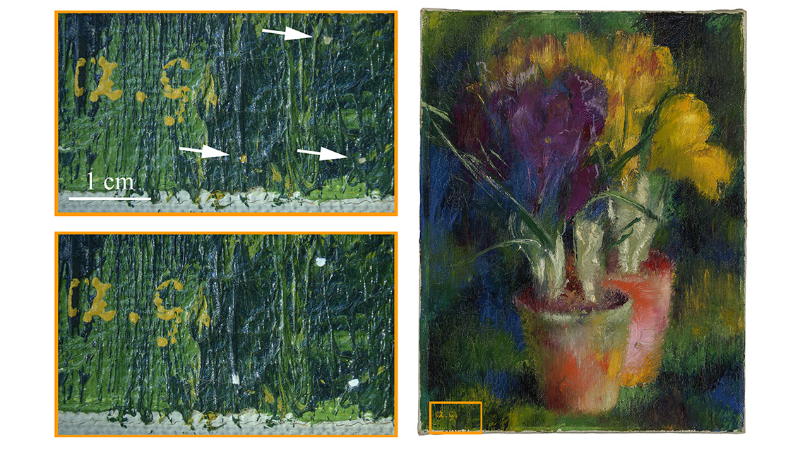 Augusto Giacometti, Krokusse in Blumentöpfen, 1932, ölhaltige Farbe auf Gewebe, 35 x 27 cm. Oben links: vor der Restaurierung, mit winzigen Ausbrüchen (Pfeile); unten links: während der Restaurierung, mit winzigen Kittungen; rechts: Gesamtaufnahme nach der Restaurierung