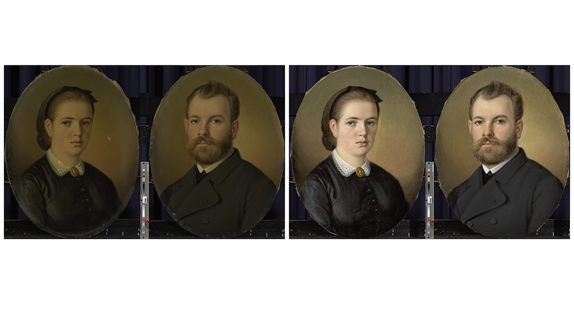 Anton Boch, Porträt Maria Beltinger, geb. Roth und Porträt Anselm Beltinger, um 1871, Ölfarbe auf Leinwand, 53 x 41 cm. Links: vor der Firnisabnahme; rechts: nach der Firnisabnahme