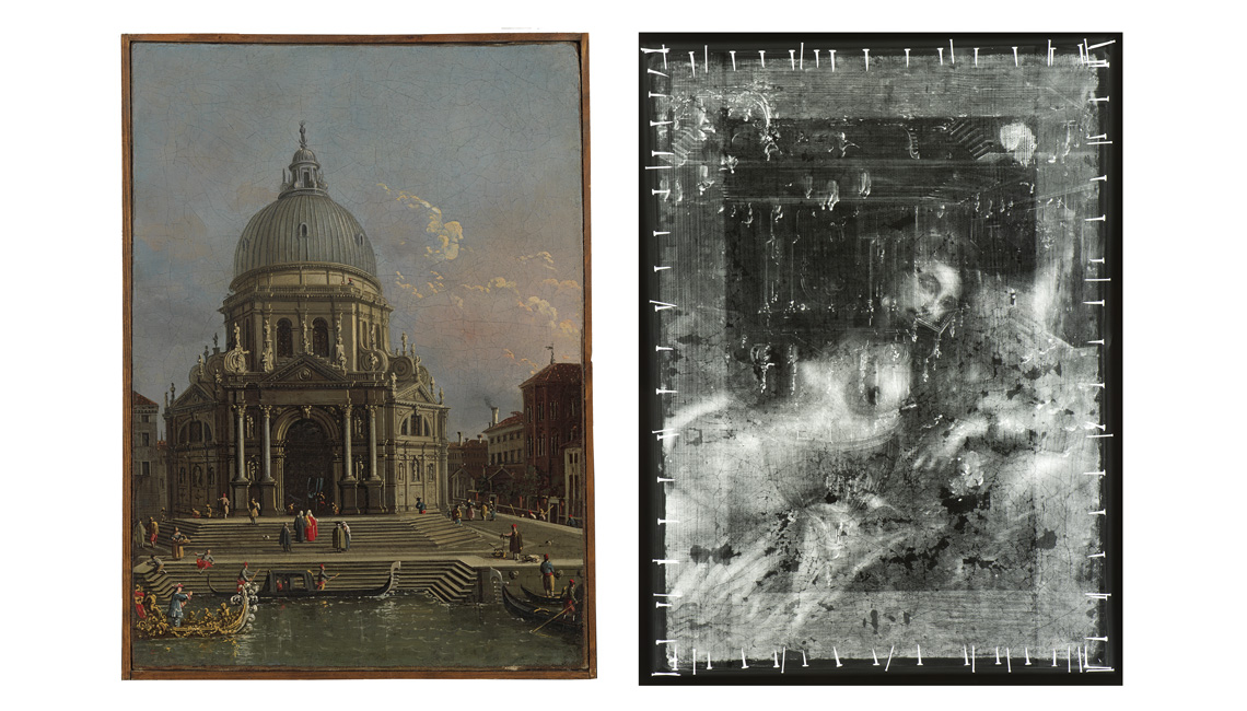 Canaletto, Basilica Santa Maria delle Salute, um 1750, Ölfarbe auf Leinwand, 48,5 x 35,5 cm. Links: im sichtbaren Licht; rechts: im Röntgenbild, um 180° gedreht