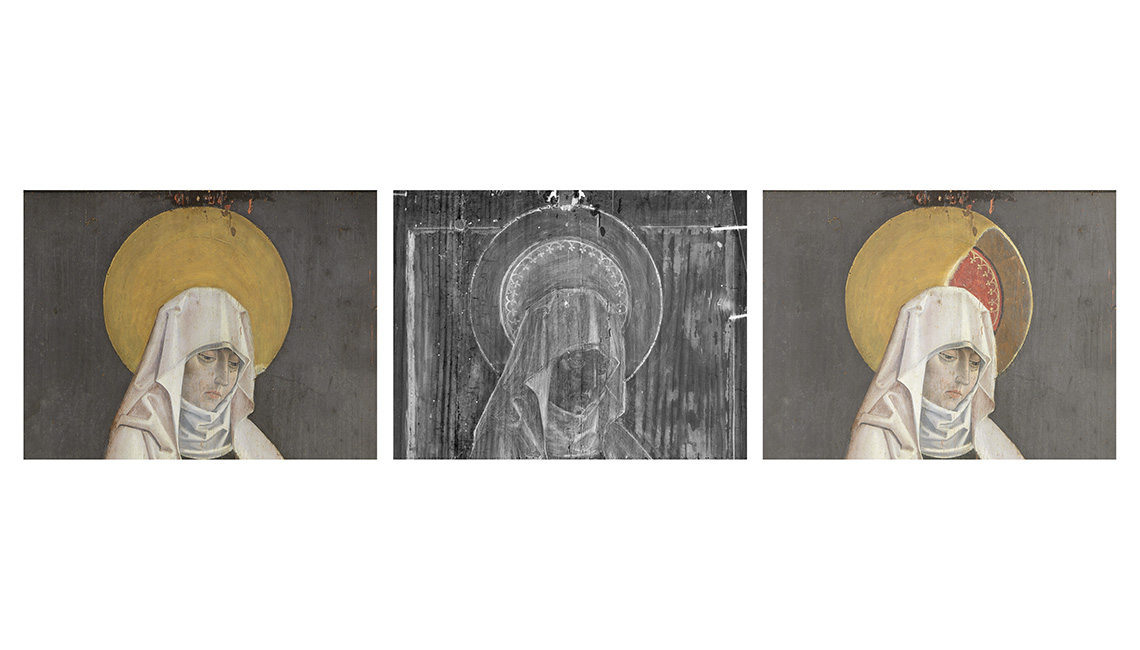 Unbekannt (Nürnberg), Maria (Ausschnitt), um 1500, ölhaltige Farbe auf Holztafel, 115,5 x 41 cm. Links: Vorzustand im sichtbaren Licht; Mitte: im Röntgenbild; rechts: Zwischenzustand während der Restaurierung