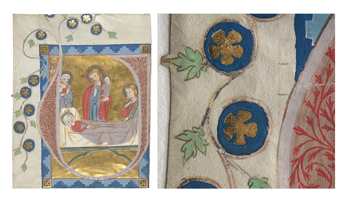 Unbekannt, Initiale V, Tod Mariä, Fragment aus einem Antiphonar, um 1300, Farbe und Blattgold auf Pergament, 22,5 x 17,6 cm. Links: Gesamtaufnahme im Auflicht; rechts: Ausschnitt im Streiflicht