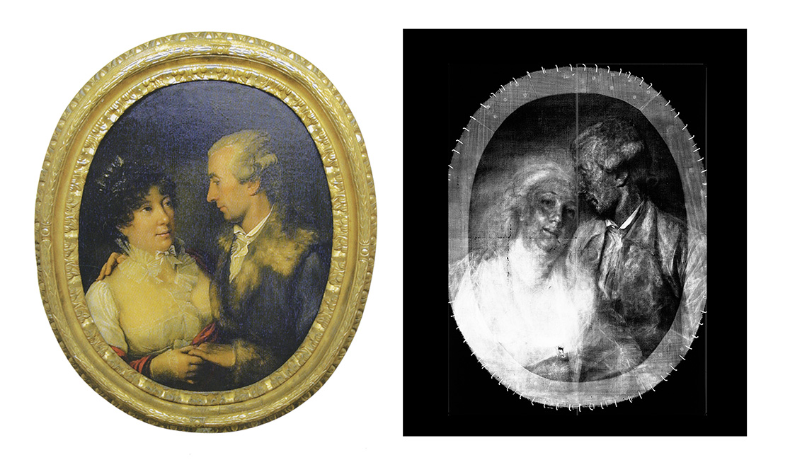 Unbekannt, Frédéric-Robert Meuricoffre und seine Gattin Henriette Hillmer, um 1779, Ölfarbe auf Leinwand, 76 x 61 cm. Links: im sichtbaren Licht; rechts: im Röntgenbild