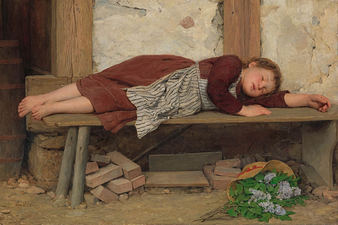 Albert Anker, Schlafendes Mädchen auf einer Holzbank, around 1900, oil on canvas, 45 x 70 cm, private collection (archive number 1210310002)