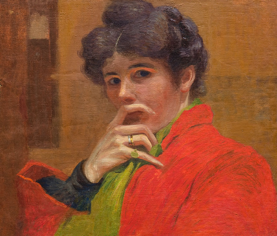 Marguerite Burnat-Provins, Autoportrait, le doigt sur la bouche, um 1900, Öl auf Leinwand, Privatbesitz (Archiv-Nr. 2012160002)
