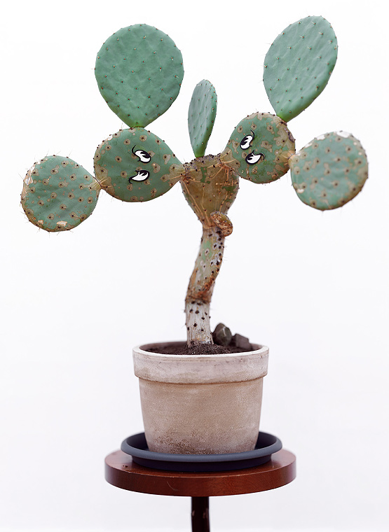 Haus am Gern, Selbstportrait als Künstlerpaar XXIV, 2015, Kaktus (optuntia robusta) in Topf mit Erde, 4 Papieraugen montiert, auf Untersetzer, auf Tisch, Masse unbekannt, Standort unbekannt (SIK-ISEA-Inventarnummer 1603230010)
