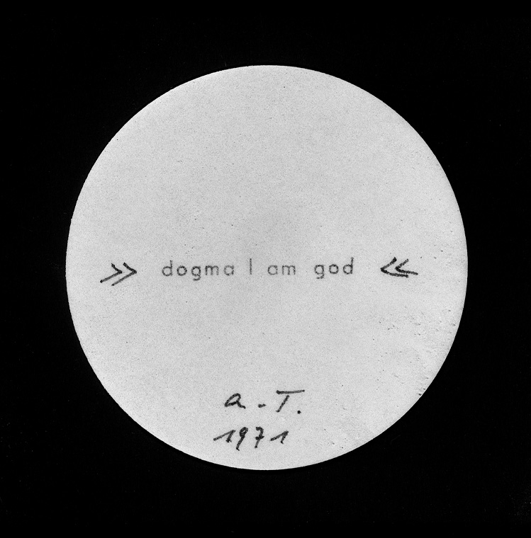 André Thomkins, >>Dogma I am god<<, 1971, Stempeldruck auf Hostie, 8 cm Durchmesser, Privatbesitz (SIK-ISEA-Inventarnummer 78341)
