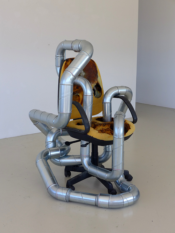 Maya Bringolf, Inhale/Exhale, 2019, Abgefackelter Bürostuhl, Lüftungsrohre, 106 x 100 x 100 cm, Standort unbekannt (SIK-ISEA-Inventarnummer 2010270024)