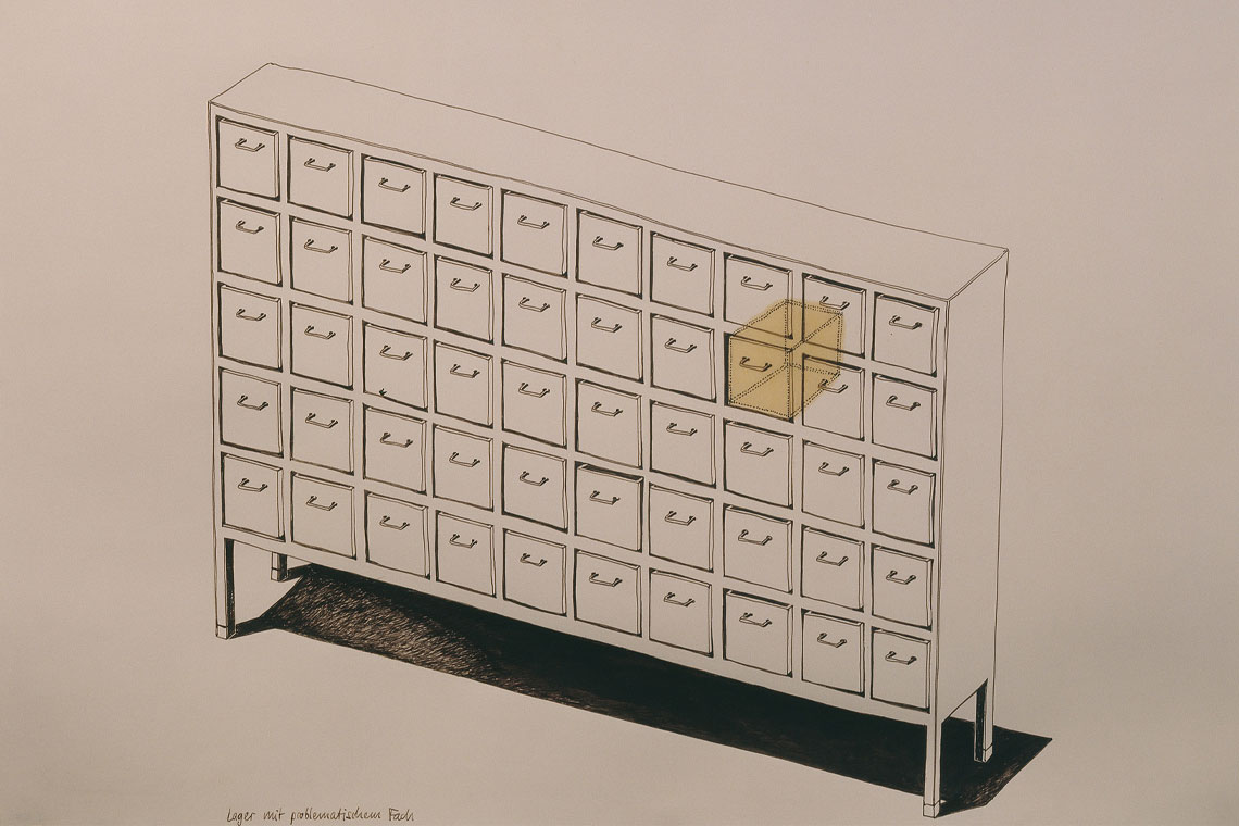 Sandra Boeschenstein, Lager mit problematischem Fach, 2000/2001, Tusche und Leinöl auf Papier, 42 x 59,5 cm, Zürcher Kantonalbank, Zürich (SIK-ISEA-Inventarnummer 87224)