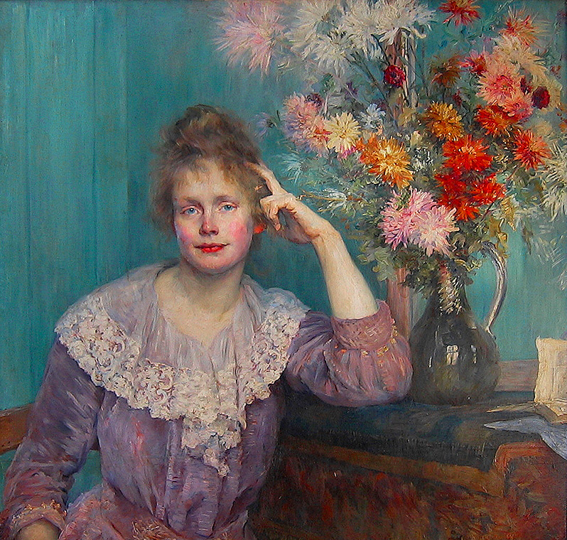 Marie Louise Catherine Breslau, Jeune femme et chrysanthèmes - Portrait de Wilhelmina Carlsson-Bredberg, 1890, huile sur toile, 95 x 91,5 cm, lieu de conservation inconnu (numéro d’inventaire SIK-ISEA 92221)