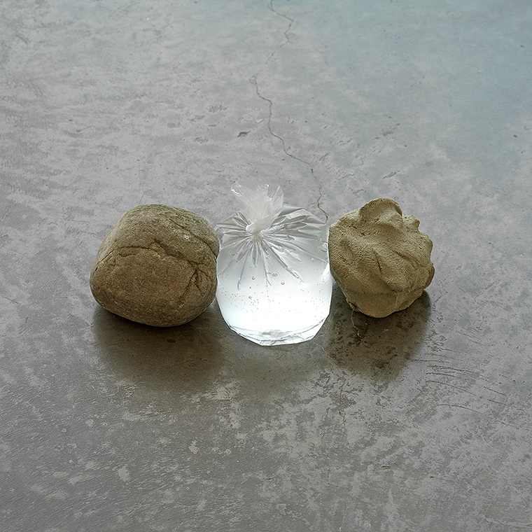 Vanessa Billy, Wait, Sit, Converse, 2009, eau, plastique, pierre, ciment, 12 x 12 x 12 cm (chaque élément), lieu de conservation inconnu (numéro d’inventaire SIK-ISEA 1910310005)