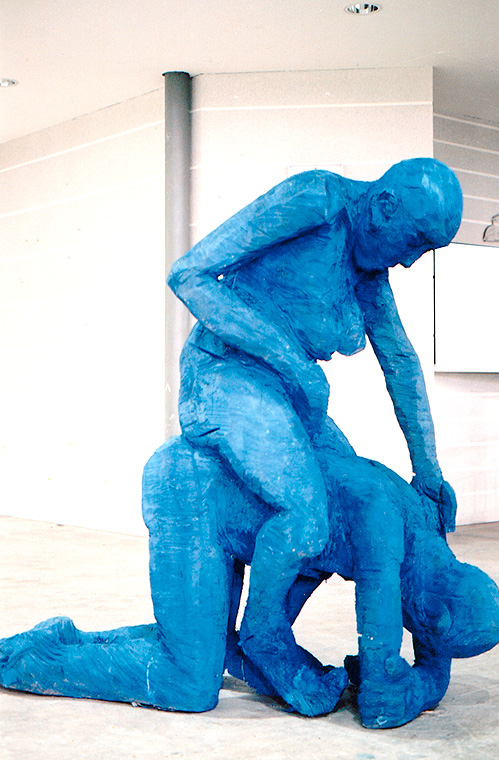 Lilian Hasler, Den Hausherrn reiten, Geschlechterkampf I., 1996, bois de peuplier peint, 160 x 160 x 100 cm, collection privée (numéro d’inventaire SIK-ISEA 89415)