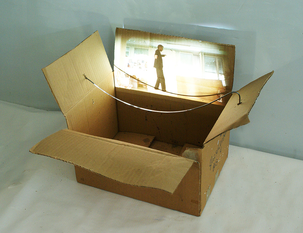 Ursula Palla, balance, 2012/2013, boîte en carton, fil de fer, vidéoprojecteur, movebox, boucle vidéo 5 minutes, sans son, dimensions inconnues, Kunstmuseum Bern (numéro d’inventaire SIK-ISEA 1408280011)