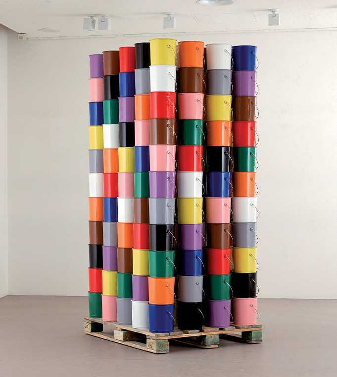 Gilles Porret, Palette de couleurs, 1990, Holzpalette, 220 Eisenkanister, Zweikomponentenfarbe, 235 x 120 x 100 cm, Musée d’art du Valais, Sitten (SIK-ISEA-Inventarnummer 1804100005)