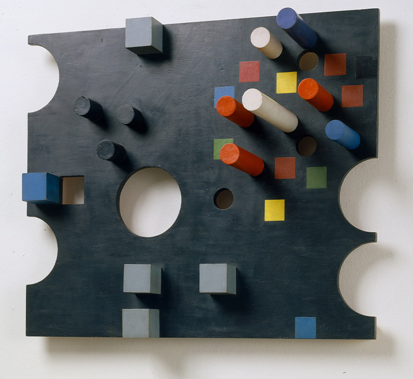 Sophie Taeuber-Arp, Rechteckiges, Mehrfarbiges Relief mit Kreisen, Quadraten, Kuben und Zylindern, 1938, Öl auf Holz, 55 x 65 x 21,8 cm, Kunstmuseum Bern (SIK-ISEA-Inventarnummer 94599)